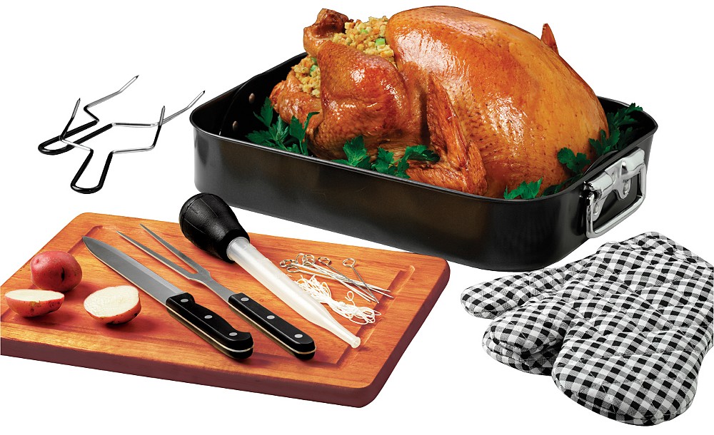 This is a really nice deal. Everything you need for roasting. This essential set includes a large 16" roaster with flat rack and locking flip-down handles, a 15" cutting board, two oven mitts, a carving knife and carving fork, two turkey lifters, and a baster and lacing set. 17-3/4 in. L x 3-1/8 in. W x 12-3/4 in. H. 9 lbs.